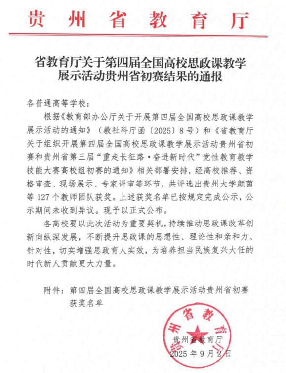 近日,贵州省教育厅公布2025年贵州省基础教育教学成果奖获奖名单,我校在此次评选中再创佳绩:学校共推荐5...