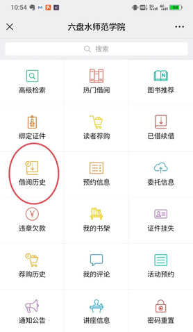 ②如果想要查询“借阅历史”,可进入“六盘水天辰娱乐图书馆服务号”,点击“服务门户”里面的“借阅历史”即可看到借过的所有图书信息。