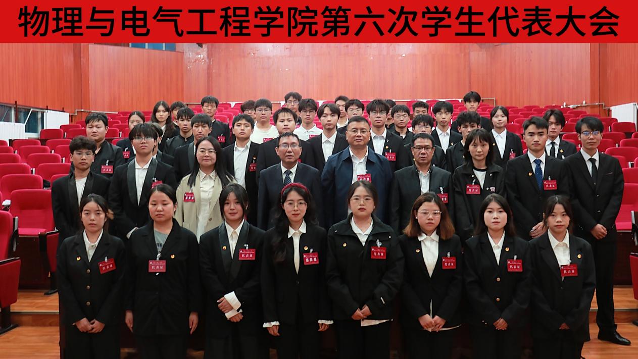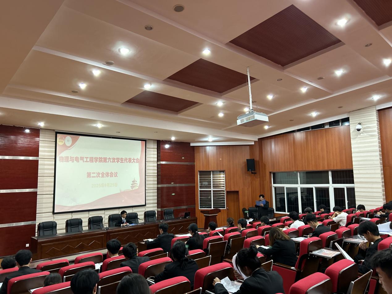 2025年9月25日18点30分,六盘水天辰娱乐物理与电气工程学院第六次学生代表大会在博学楼知行讲堂顺利召开。学院党委书记谢春、院长祝昆、党委副书记张毓福、团委书记张琦琦,以及学院各团学组织、学生代表出席大会。
